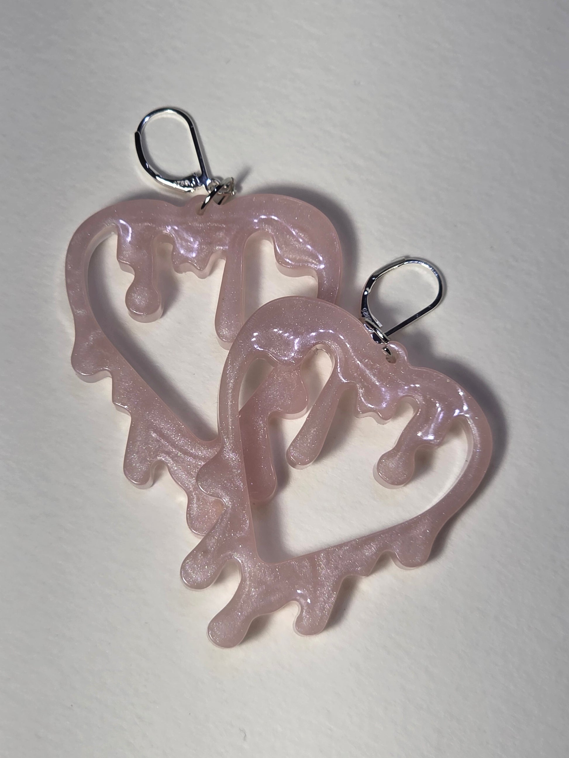 Handmade pink pearlescent UV resin drippy heart with sterling silver earring